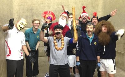 Players at the Aldenham Heath Fives Club turned out in fancy dress last night (Tuesday 18 December) for an evening of fun and frolics. The theme this year was facial hair with a prize for the best effort. Left-hander Chris Austin won with his Frenchman get-up. His prize: the last sandwich on the tray (ham salad) in the Round Bush.