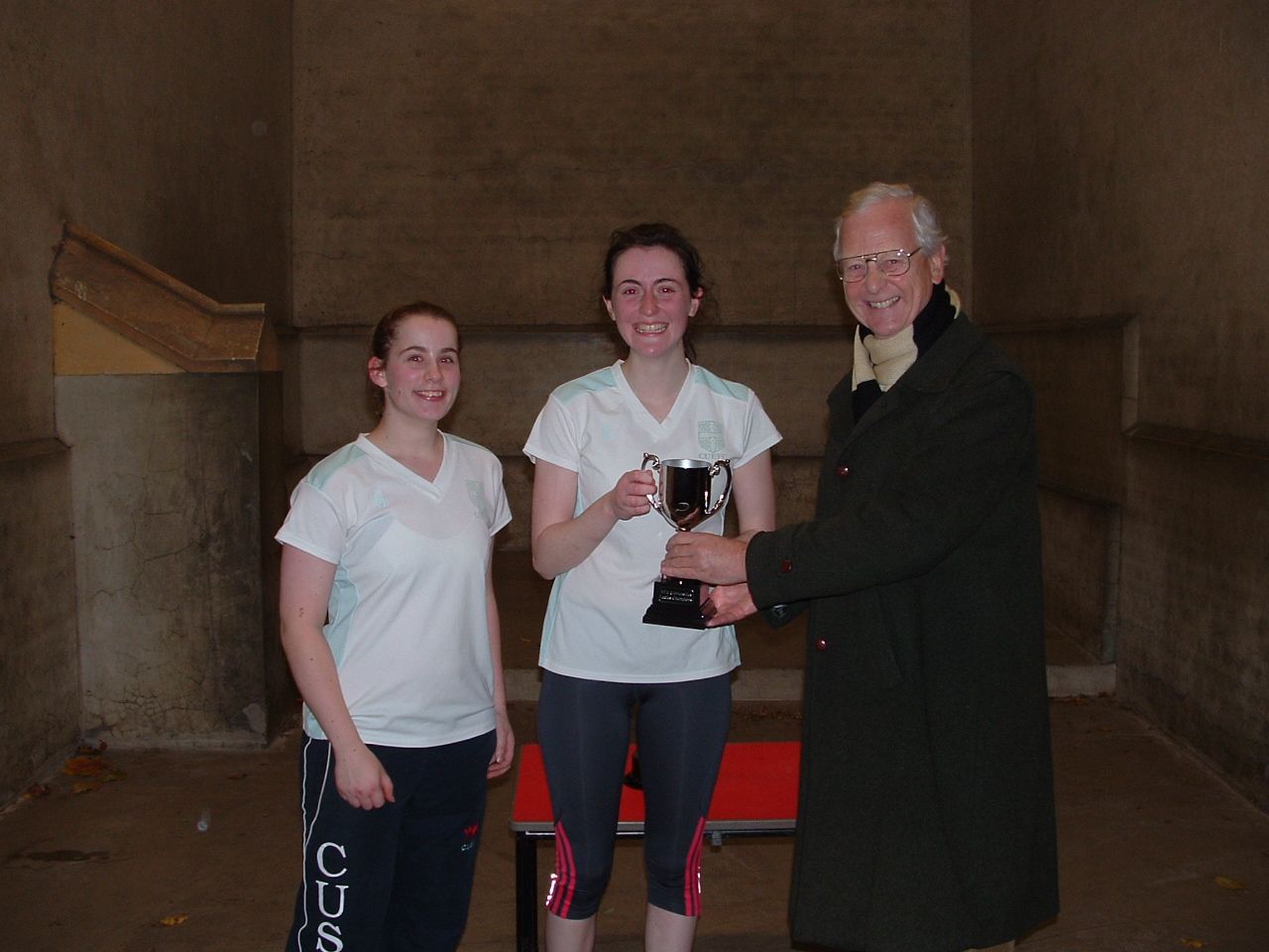 The final, the last match of the day to be finished, was watched by a large and vociferous crowd and showed just how much the standard of Ladies Fives has improved in the last few years. There was very little to choose between the two pairs right from the start, but despite being up against two former schools’ champions in Rosie and Hannah, the Cambridge pair always managed to keep their noses in front to win the match 12-10, 12-10. This was a splendid achievement, given both the quality of the opposition and the fact that Karen has only been playing the game for just over a year. In the final analysis, however, it was probably her impressive cutting and volleying that proved decisive for Cambridge.