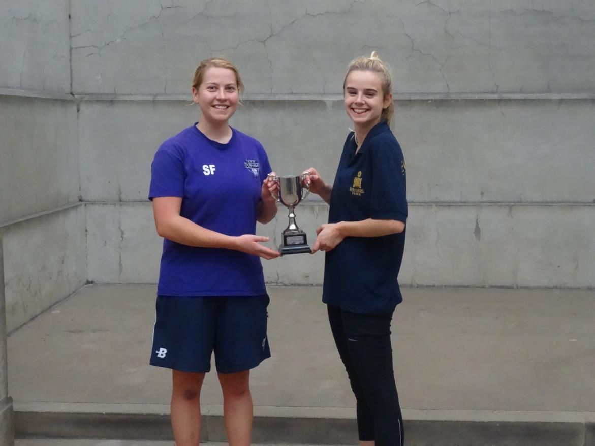 Injury was taking its toll, however, and despite a valiant effort they were no match for the increasingly confident Durham pair. Cambridge 1 overcame Cambridge 2 in the other semi-final to set up what looked like it should be a good contest in the final. Sarah and Lucy had other ideas, however. With Sarah dominating the top step, volleying hard and hitting aggressvely to the back corners and with Lucy showing some classy touches and returning cut well, the Cambridge pair never managed to get any kind of foothold in the game, the Durham pair winning 12-3, 12-0 in double quick time to claim a well-deserved victory.
