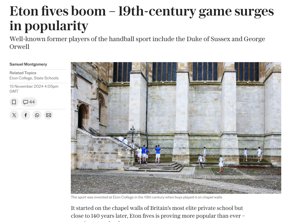 18/11/24: The new courts at Holyport College formed the basis for a substantial feature on Eton Fives in Saturday’s edition of The Telegraph.
