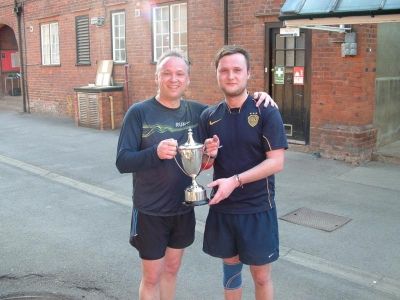 An all Salopian final pitted the 2009 winners Mike and Chis Hughes against the holders Peter and Rex Worth. Hard though the Worths fought the Hughes retained the advantage throughout. The crisper volleying power of the Hughes was to prove decisive as the Worths, to their credit, valiantly retrieved the ball time and time again to stay in the match. Time out for Chris with cramp gave the Worths a breather but to no avail. Rex did his best to encourage his tiring father but in the end the Hughes ran out comfortable winners 12-5, 12-6.