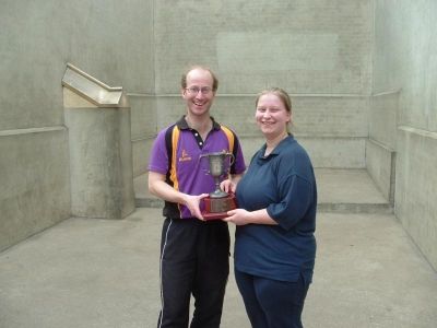 In the first semi-final, Hoskins and Scott - Midlands festival winners earlier in the season - threw everything they had at the Cooleys but to no avail, going down 12-3, 12-7. The other semi-final had all the hallmarks of the match of the day and didn't disappoint. Perrie and Scoones overcame their dodgy ankles to sneak the first game 13-12, but in the end George Campbell was the one player on the court who seemed to be expecting rather than hoping to win, and he managed to transmit enough of this to Katharina for her to step up impressively. The second and third games were close but the Lancing/Zuoz pair had the edge and made it through to the final.